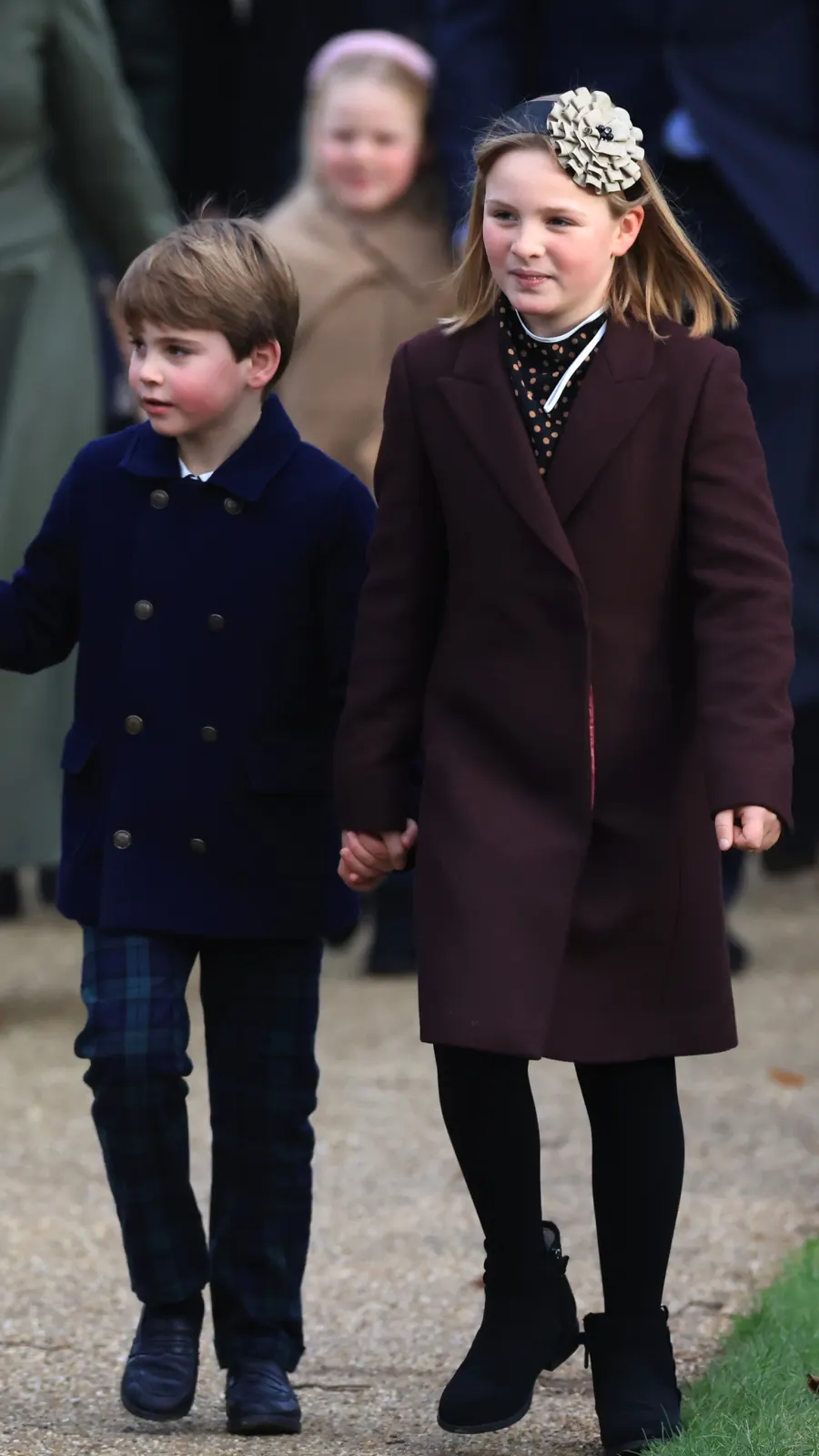 Nun schloss sich der Kreis, als Prinz Louis zum Weihnachtsgottesdienst in Sandringham Hand in Hand mit seiner Cousine Mia Tindall (9) in einer Tartan-Hose erschien, die zuvor sein Bruder George getragen hatte.