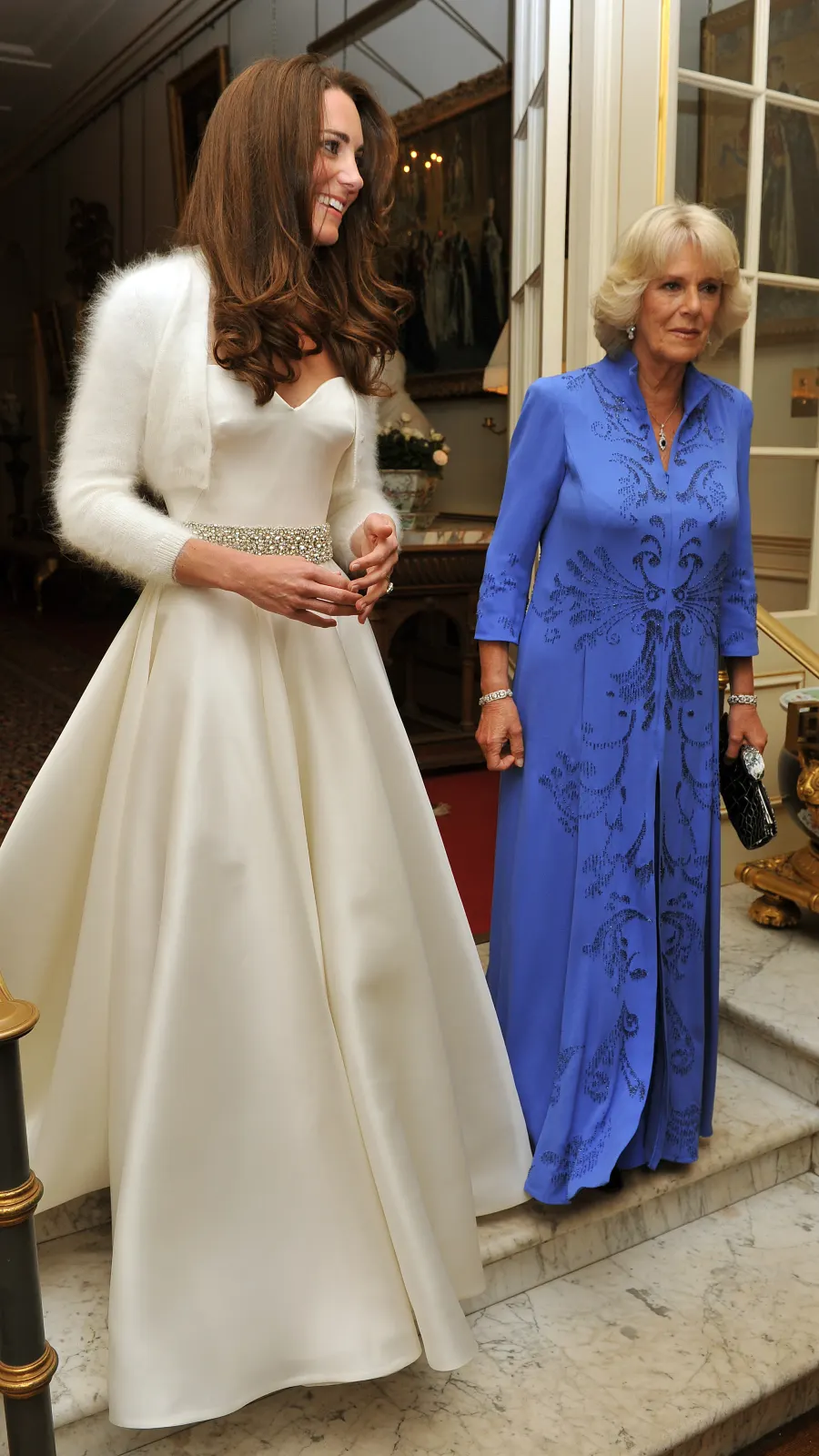 Das Kleid war aus weißem Satin und hatte einen herzförmigen, schulterfreien Ausschnitt. Catherines Taille zierte ein diamantbesetzter Gürtel. Dazu trug die Herzogin eine süße Strickjacke aus Angorawolle.