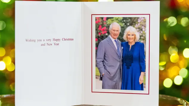 Charles trägt einen hellgrauen Anzug mit einer blauen gepunkteten Krawatte, während Camilla in einem indigofarbenen Kleid von Fiona Clare erstrahlt, das sie mit goldenen Ohrringen ergänzt. Die Botschaft auf der Karte lautet: "Wir wünschen Ihnen ein frohes Weihnachten und ein schönes neues Jahr."