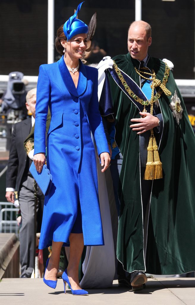 Während Prinz William die RAF-Uniform Nr. 1 mit seinem Distelorden trug, entschied sich Kate für ein saphierblaues Mantelkleid der Designerin Catherine Walker. Das Outfit ist kein unbekanntes - der Royal trug das Kleid bereits zweimal, erstmals beim Commonwealth Day Service im Jahr 2022 sowie 2023 zum Gottesdienst am Ostersonntag in Westminster.