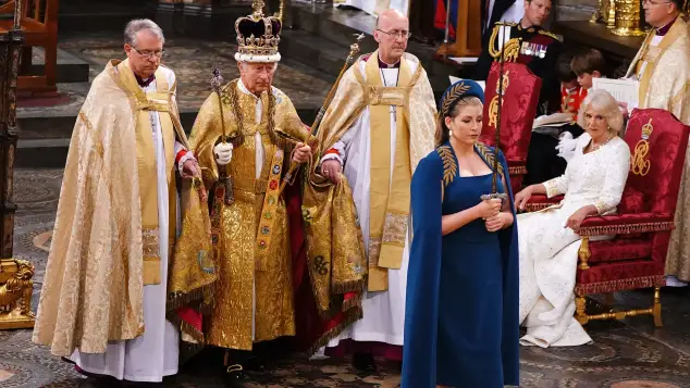 König Charles trägt einen Königsmantel, der sich aus mehreren einzelnen Kleidungsstücken zusammensetzt: Die sogenannte Obertunica besteht aus goldenen Seidenfäden und ist mit Gold- sowie Silberapplikationen und Blumenmustern verziert. Diese Tunica wiegt etwa zwei Kilogramm und wurde für König George V. 1911 gefertigt.