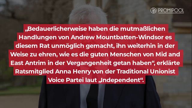 Und weiter: „Bedauerlicherweise haben die mutmaßlichen Handlungen von Andrew Mountbatten-Windsor es diesem Rat unmöglich gemacht, ihn weiterhin in der Weise zu ehren, wie es die guten Menschen von Mid and East Antrim in der Vergangenheit getan haben.“
