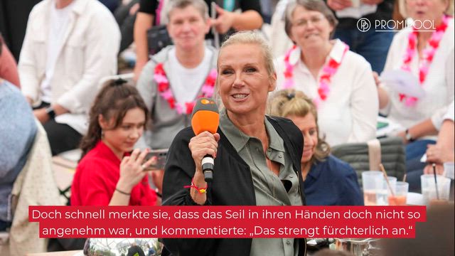 Expertin Ramona Mühl erklärte, dass spezielle Schuhe mit Metallsohlen für den nötigen Grip sorgen. „Das sieht eigentlich ganz relaxt aus, weil es gibt diese ganz speziellen Schuhe“, so Kiwi. Doch schnell merkte sie, dass das Seil in ihren Händen doch nicht so angenehm war, und kommentierte: „Das strengt fürchterlich an.“
