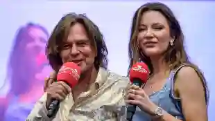 Während sich Joelina für ein zauberhaftes Dirndl in einem schönen Türkis-Ton entschieden hat, trägt Jürgen Drews Lederhose und Trachtenhemd. Dazu kombiniert er eine schicke blaue Weste.