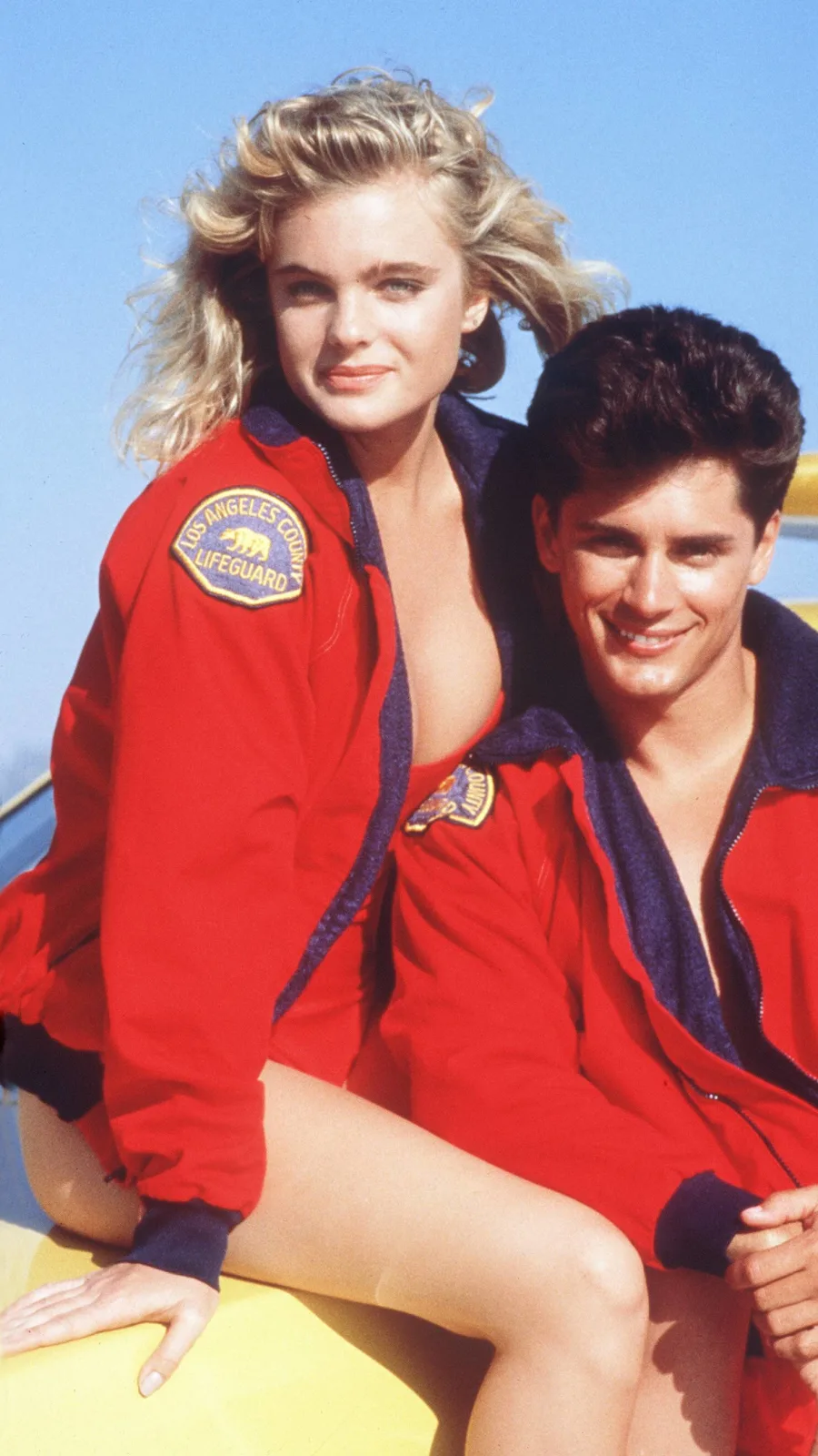 Der folgende Schnappschuss zeigt Erika Eleniak an der Seite ihres damaligen Serienkollegen und privaten Freundes Billy Warlock – so wie man sie kannte: im roten Badeanzug mit tiefem Ausschnitt, Rettungsweste und blonden, gewellten Haaren.