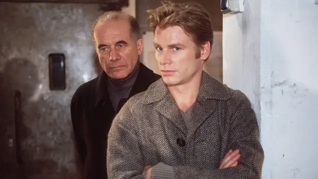 Mit noch etwas kürzeren Haaren und glatt rasiert, posiert der damals 32-Jährige mit seinem Schauspielkollegen Hanns Zischler (76). In einem übergroßen grauen Mantel und mit ernstem Blick sieht Kai Scheve ernst in die Kamera.