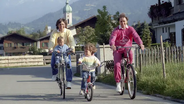 Zurück im Jahr 1985 war Felix Neureuther ein Jahr alt und bereits flott unterwegs. Fotos zeigen ihn bei einem Fahrradausflug durch seinen Heimatort Garmisch mit seinen Eltern und seiner großen Schwester Ameli. Der kleine Felix durfte auf dem Rad seiner Mama Rosi Platz nehmen.