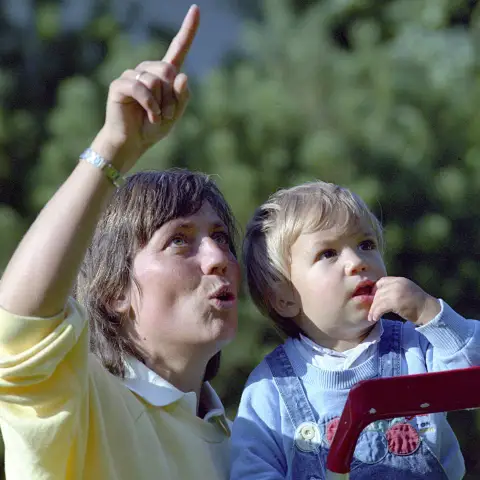Auf einem weiteren Bild von September 1985 sieht man den einjährigen Felix noch deutlicher. Der Schnappschuss zeigt ihn mit seiner Mama, die ihn gerade auf etwas aufmerksam macht. Fasziniert blickt der Blondschopf nach oben.
