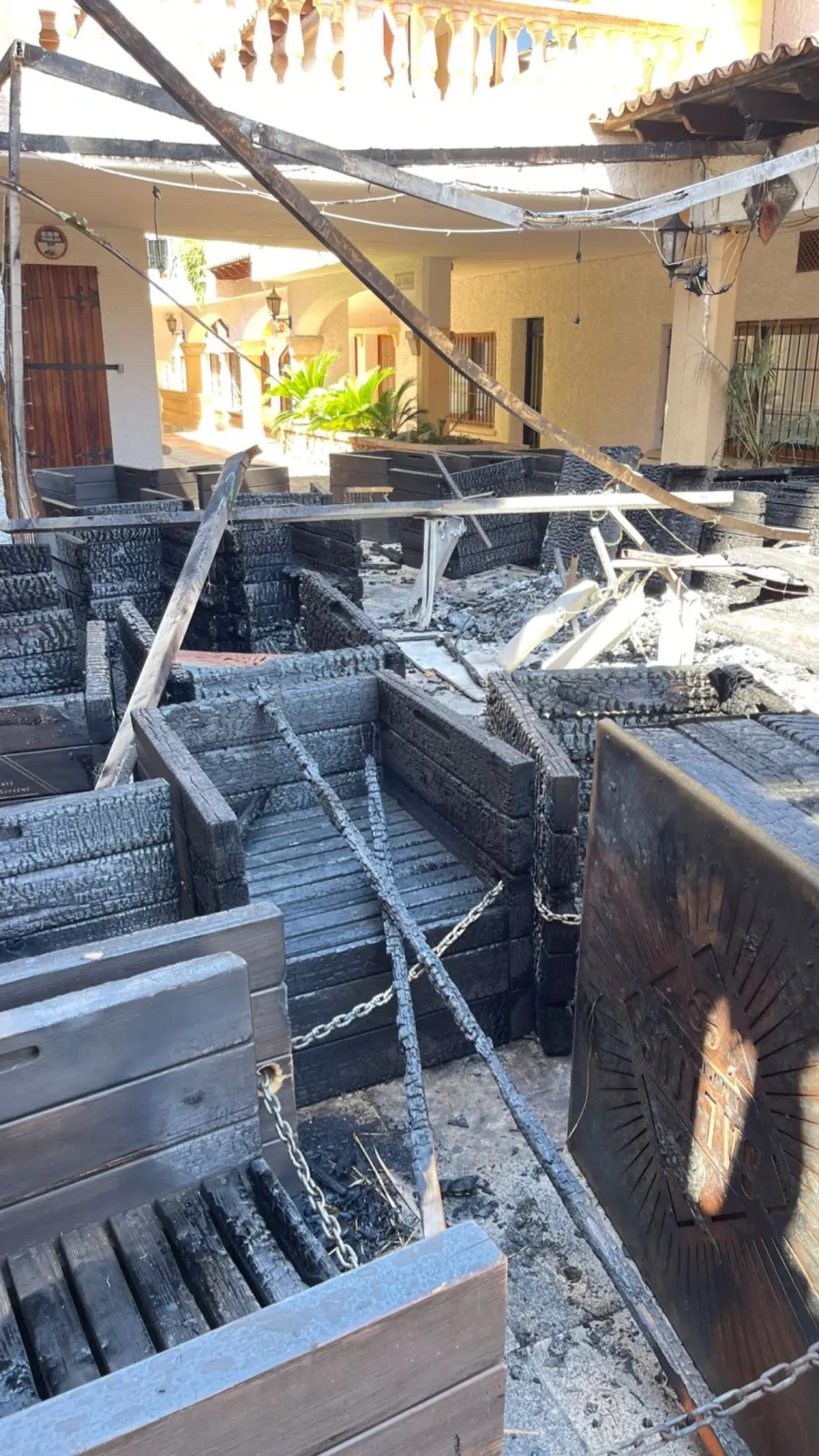 Allerdings ist der komplette Außenbereich zerstört, wie man auf Bildern sehen kann. Die Möbel wurden verbrannt, auch Wände und Deckenbalken wurden in Mitleidenschaft gezogen.
