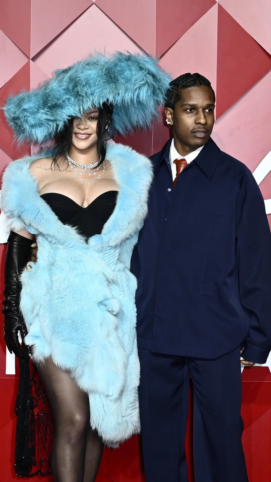 Rihanna und A$AP Rocky waren die Stargäste des Abends und zogen alle Blicke auf sich. Rihanna kam in einem eisblauen Wickel-Pelzmantel und einem passenden strukturierten Hut aus Christian Lacroixs Herbst/Winter 2002 Haute Couture Kollektion.