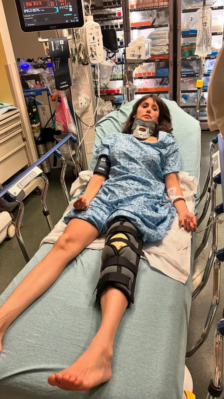 Scheinbar hat sich Nina ernsthaft am Knie verletzt, dort trägt sie eine Schiene. Außerdem wurde ihr eine stabilisierende Halskrause angelegt, welche nach Unfällen die Wirbelsäule stabilisieren soll.