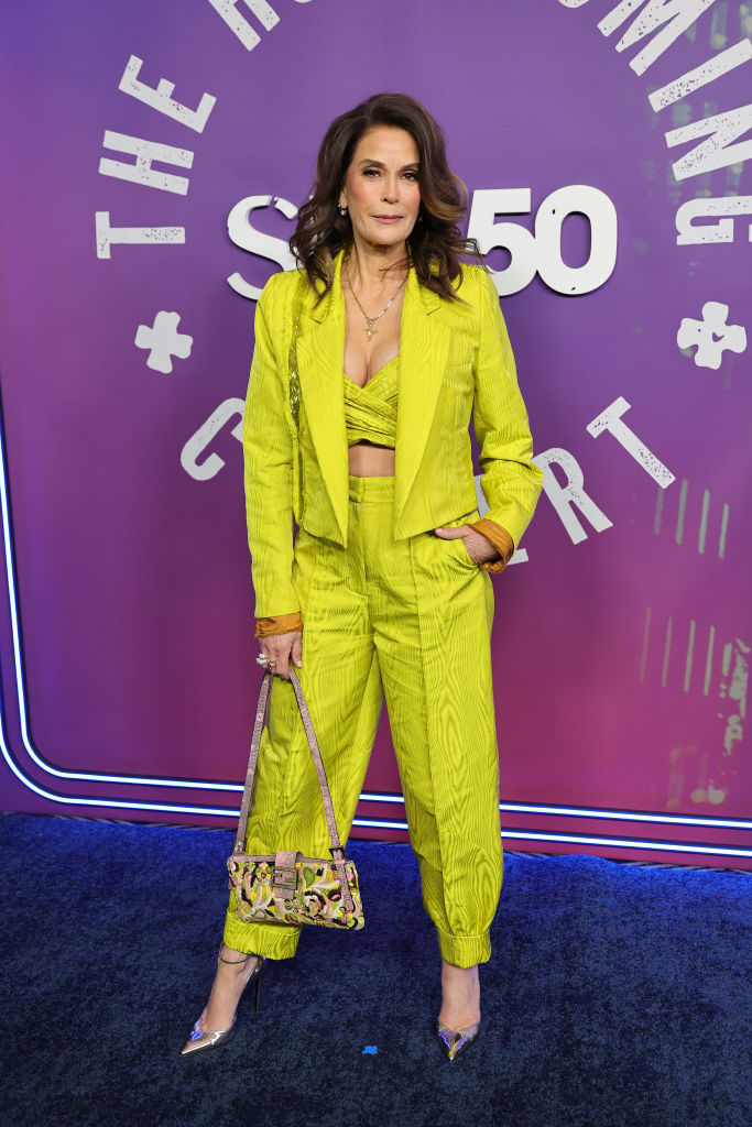 Teri Hatcher (60) sorgte am Freitagabend beim SNL50: Das Homecoming-Konzert in New York City für Aufsehen. Die 60-jährige Schauspielerin, bekannt aus "Desperate Housewives", zeigte sich in einem auffälligen gelben Bandeau-Top mit XXL-Ausschnitt und einer passenden strukturierten Jacke auf dem roten Teppich. Ihr Outfit wurde durch eine zarte goldene Kolibri-Halskette und metallische Pumps ergänzt.
