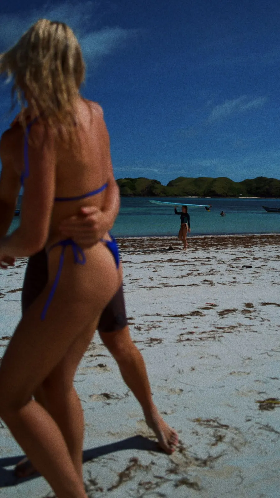 Auf dem Schnappschuss steht die GZSZ-Schauspielerin in einem blauen Bikini am Strand. Ihr Rücken ist der Kamera zugewandt, stattdessen sieht sie die Person an, die hinter ihr steht. Diese hat den Arm sanft um ihre Taille gelegt.