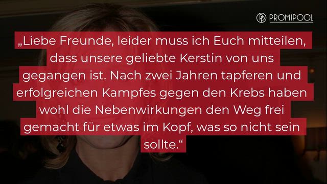 Er schrieb: „Liebe Freunde, leider muss ich Euch mitteilen, dass unsere geliebte Kerstin von uns gegangen ist. Nach zwei Jahren tapferen und erfolgreichen Kampfes gegen den Krebs haben wohl die Nebenwirkungen den Weg frei gemacht für etwas im Kopf, was so nicht sein sollte.“