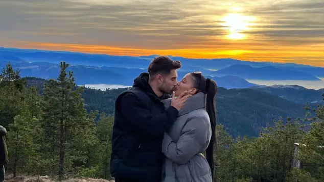 Das Paar küsst sich auf einem Berg in Serbien, wo es Familie und Freunde besucht hat. Der Sonnenuntergang im Hintergrund liefert eine romantische Kulisse.