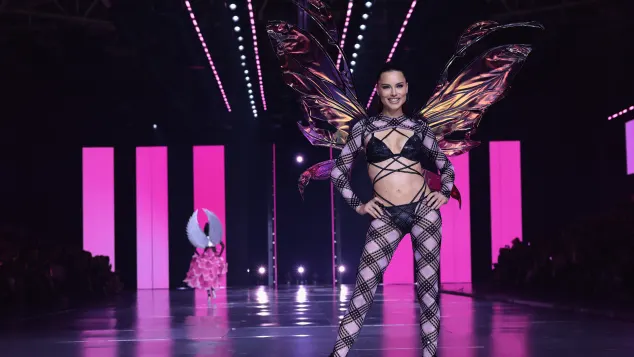 Adriana Lima trug einen funkelnden BH und Höschen im Schnür-Stil, kombiniert mit einem karierten Mini-Top und passender Hose. Komplettiert wurde ihr Look durch die ikonischen Flügel von Victoria's Secret. Lima schloss das erste Segment der Show ab, die unter anderem mit Kate Moss und den Hadid-Schwestern aufwartete.