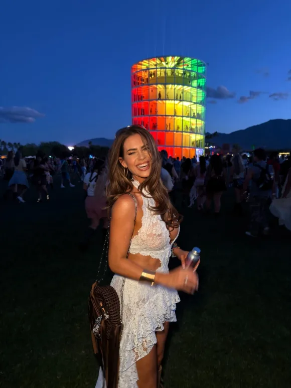 Jessica Haller besucht das Coachella 2026 natürlich top gestylt. Vor allem dieses Dress aus zarter Spitze ist ein echter Hingucker.