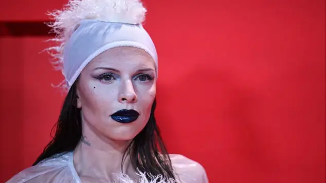 Weiß gepudert und mit schwarzen Lippen starrte sie in die Kameras. Den Look komplettierte eine nach Badekappe aussehende Kopfbedeckung mit einem Feder-Irokesen, die sie einfach über ihren offenen Haaren trug.