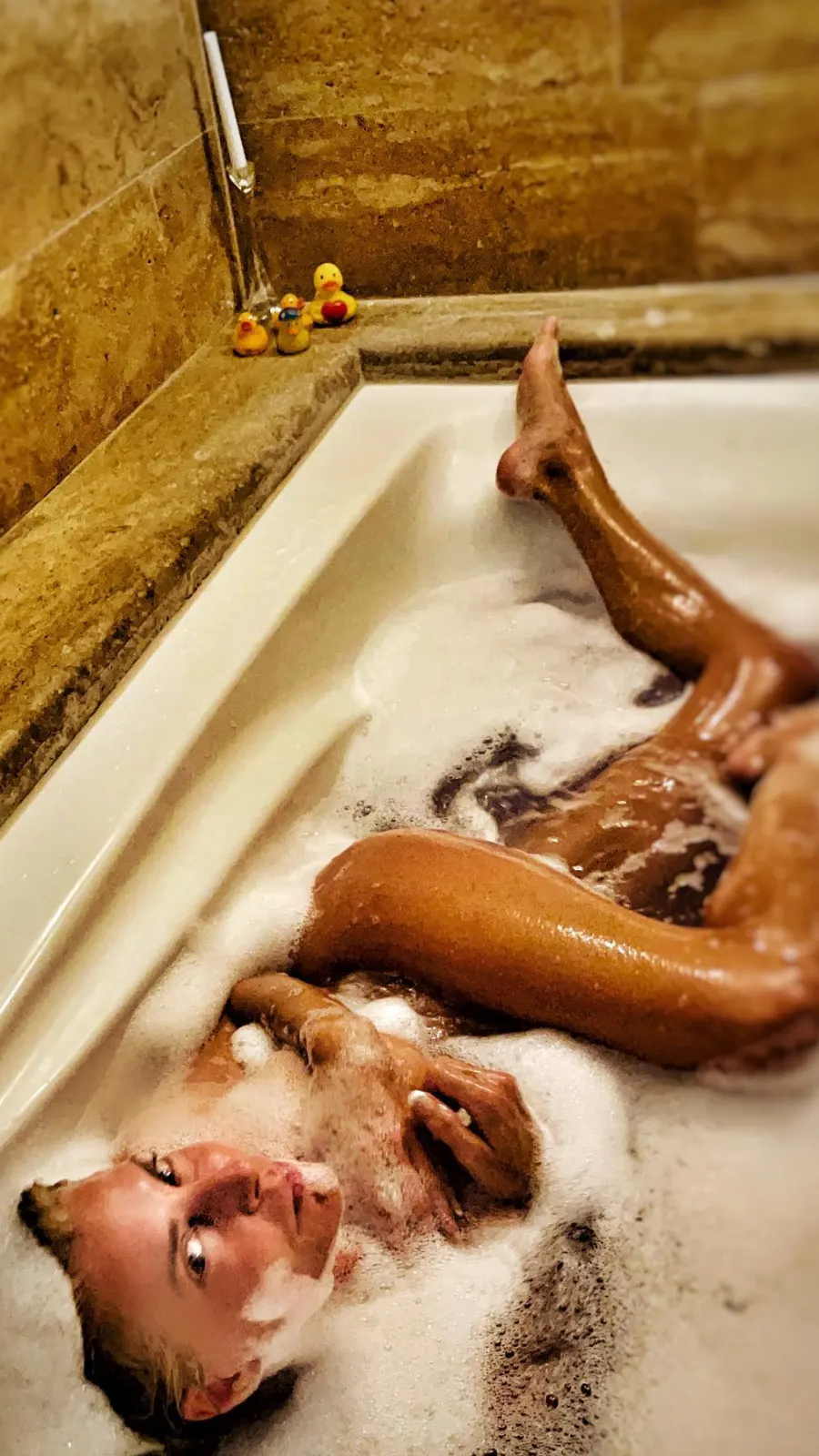 Auch hier hat sich Giulia Siegel wieder komplett hüllenlos in die Badewanne begeben. Allerdings scheint der Schaum nicht ausgereicht zu haben. Sicherheitshalber verdeckt sie mit zwei Quietscheenten ihre Brüste.