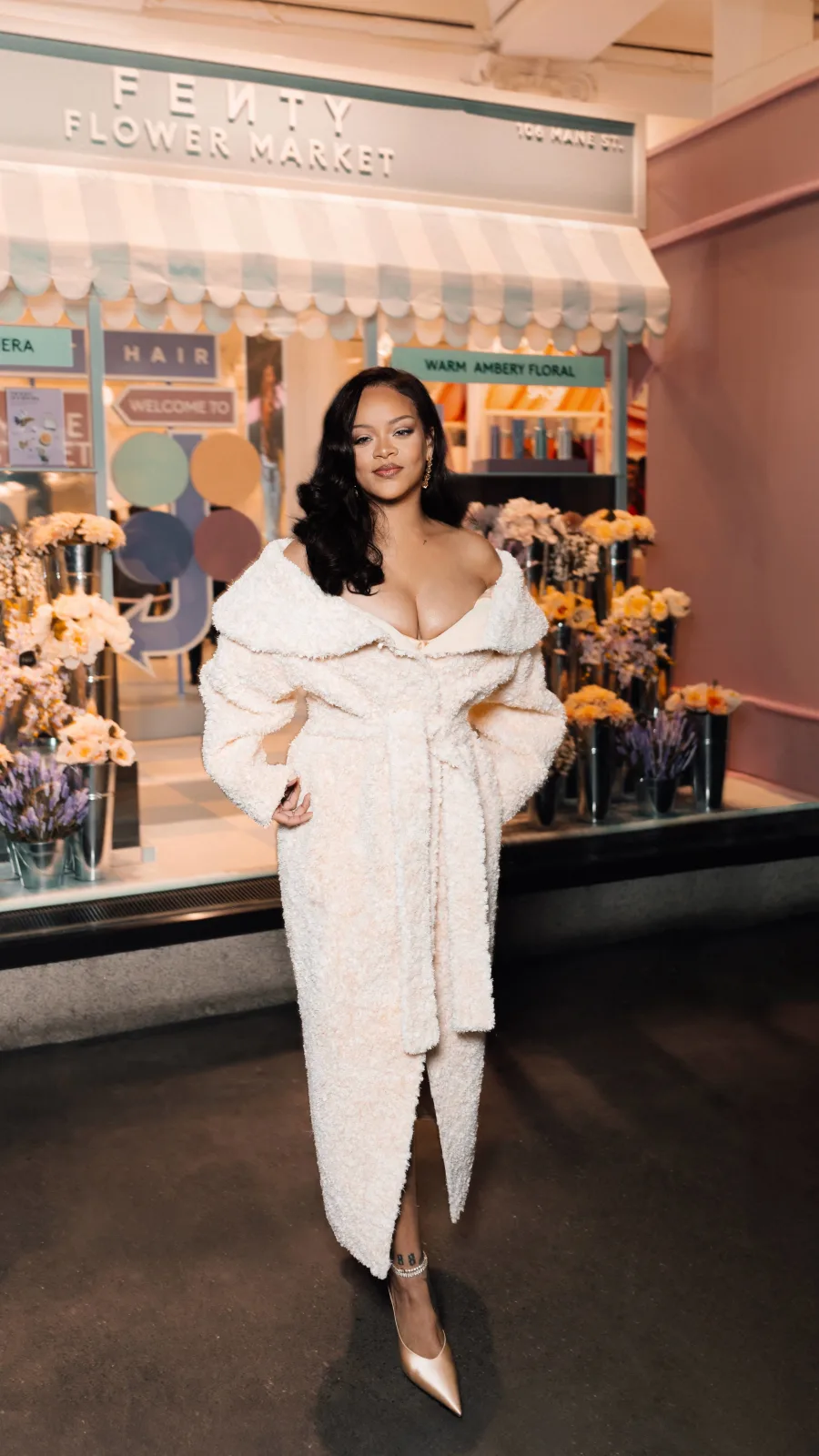Rihanna ergänzte ihren Look mit goldenen Stilettos und einem neutralen, glänzenden Make-up – alles Produkte von Fenty Beauty. Ein weiteres Highlight setzte sie mit funkelndem Schmuck aus verschiedenen Metallen.
