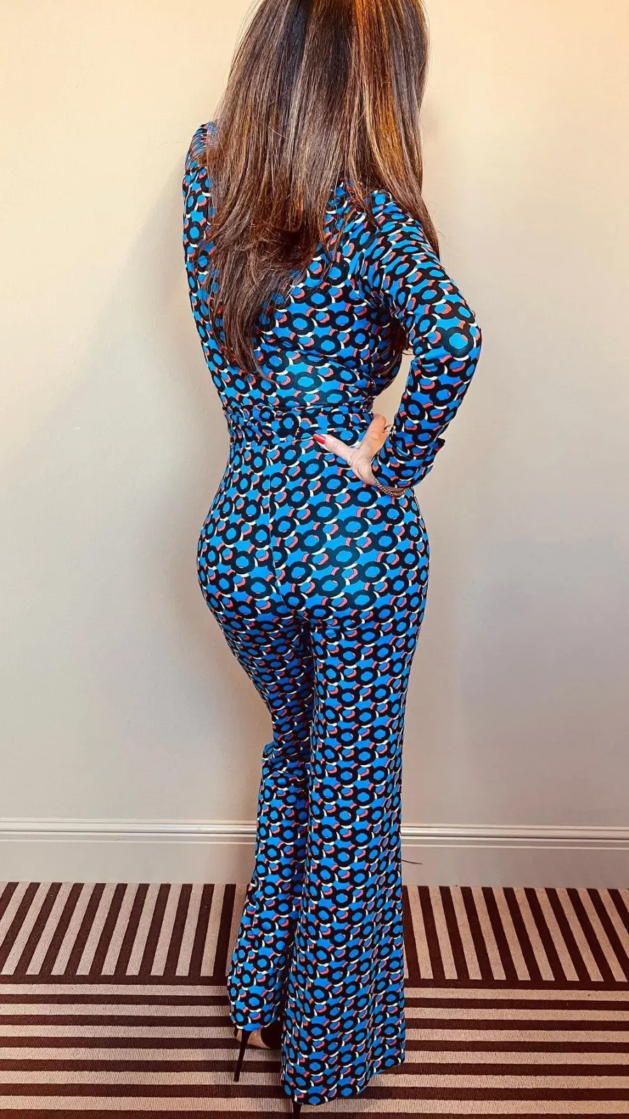 Für ihr spontanes Fotoshooting posiert Verona vor einer weißen Wand. Dabei trägt das Model einen hautengen, gemusterten Jumpsuit. Der Einteiler mit siebziger-Jahre-Flair betont die Figur der Moderatorin durch das bunte Muster und ausgestellte Bein besonders.