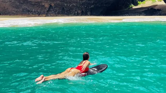 Alessandra Ambrosio hat atemberaubende Fotos von ihrem tropischen Urlaub geteilt. Die 43-Jährige genießt derzeit eine Auszeit auf Hawaii und präsentierte sich in einem sexy roten Badeanzug, der durch einen tiefen Ausschnitt und einen hochgeschnittenen Tanga besticht. Ihre dunklen Haare fallen in natürlichen Wellen, während sie die saphir- und türkisfarbenen Gewässer der Nā Pali Coast auf Kauai erkundet.