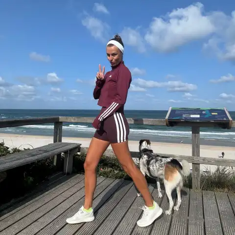 In einem burgunderroten Adidas-Set bestehend aus einem langärmeligen Oberteil und knappen Shorts, setzt sie ihre atemberaubende Figur perfekt in Szene. Die weißen Streifen an den Seiten und die passenden Sneakers runden den sportlichen Look ab. Das Outfit strahlt nicht nur Fitness, sondern auch eine gewisse Lässigkeit aus, die perfekt zur Strandkulisse von Sylt passt.