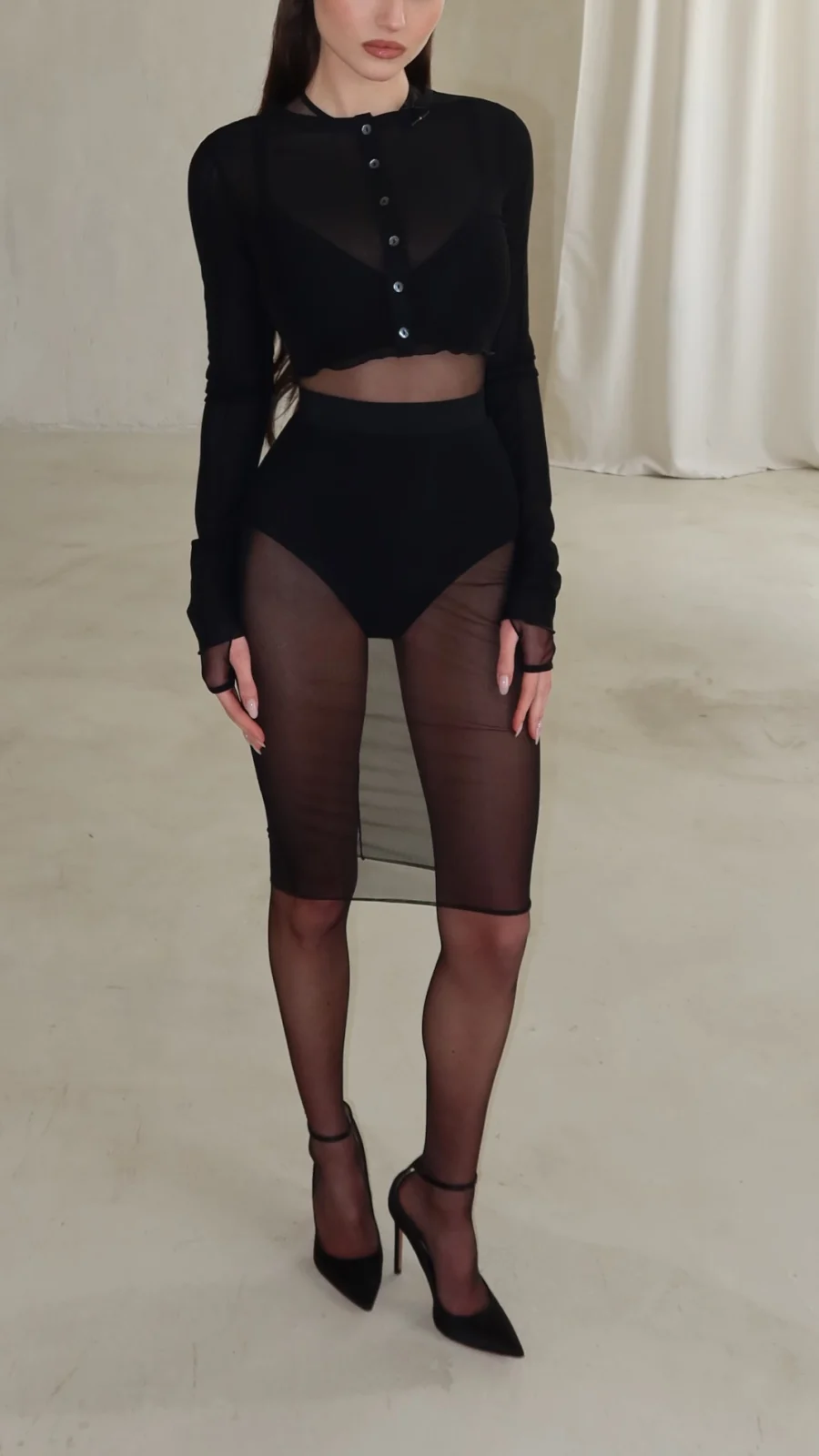 Leni Klum (20) hat in ihrer Instagram-Story mit einem auffälligen Outfit für Furore gesorgt. In einem transparenten schwarzen Rock, der den Blick auf einen hochgeschnittenen, ebenfalls schwarzen Slip freigibt, zeigt sich die junge Schönheit in einem Look, der sowohl gewagt als auch stilvoll ist. Kombiniert wird das Outfit mit einem Cropped-Cardigan, unter dem ihr BH hervorschaut.