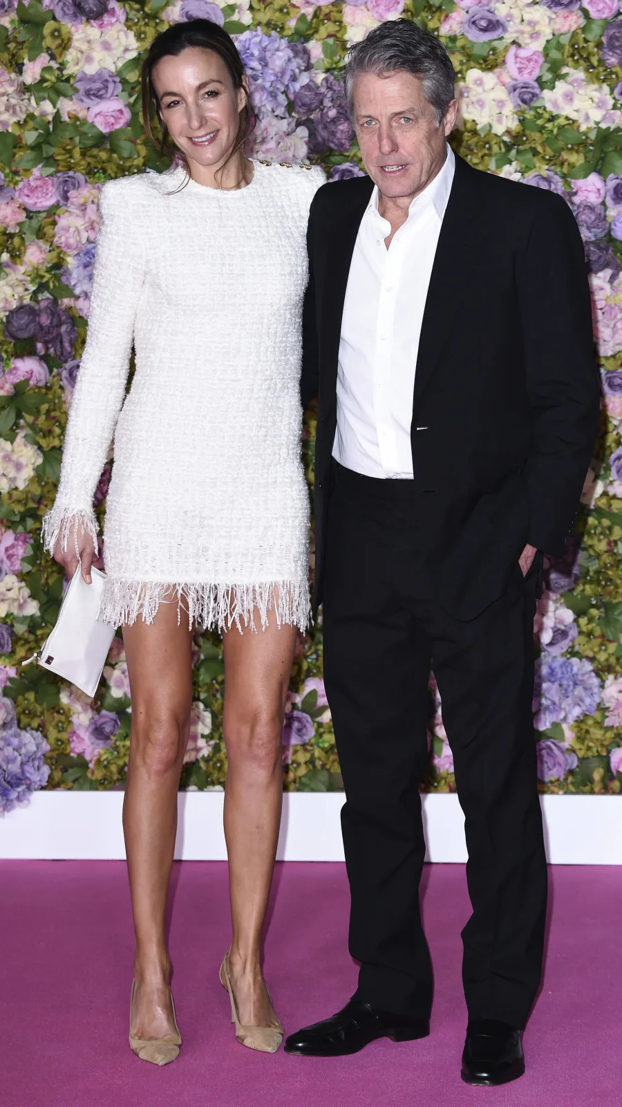 Das Paar konnte das Lächeln nicht verbergen, als es Arm in Arm über den roten Teppich schritt. Hugh Grant trug ein weißes, offen getragenes Hemd, darüber ein Sakko, und elegante schwarze Lederschuhe.