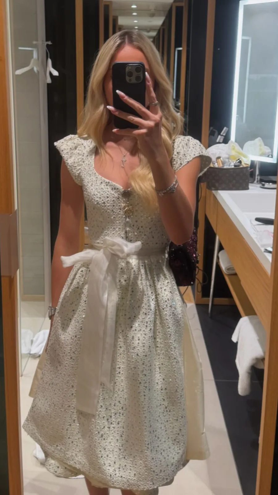 In einem traditionellen Dirndl ganz in Weiß, das perfekt zu Shania passt, zeigt sie, wie stilvoll Trachtenmode sein kann. Das Dirndl besticht durch seinen klassischen Schnitt und die liebevollen Details, die es zu einem echten Hingucker machen.