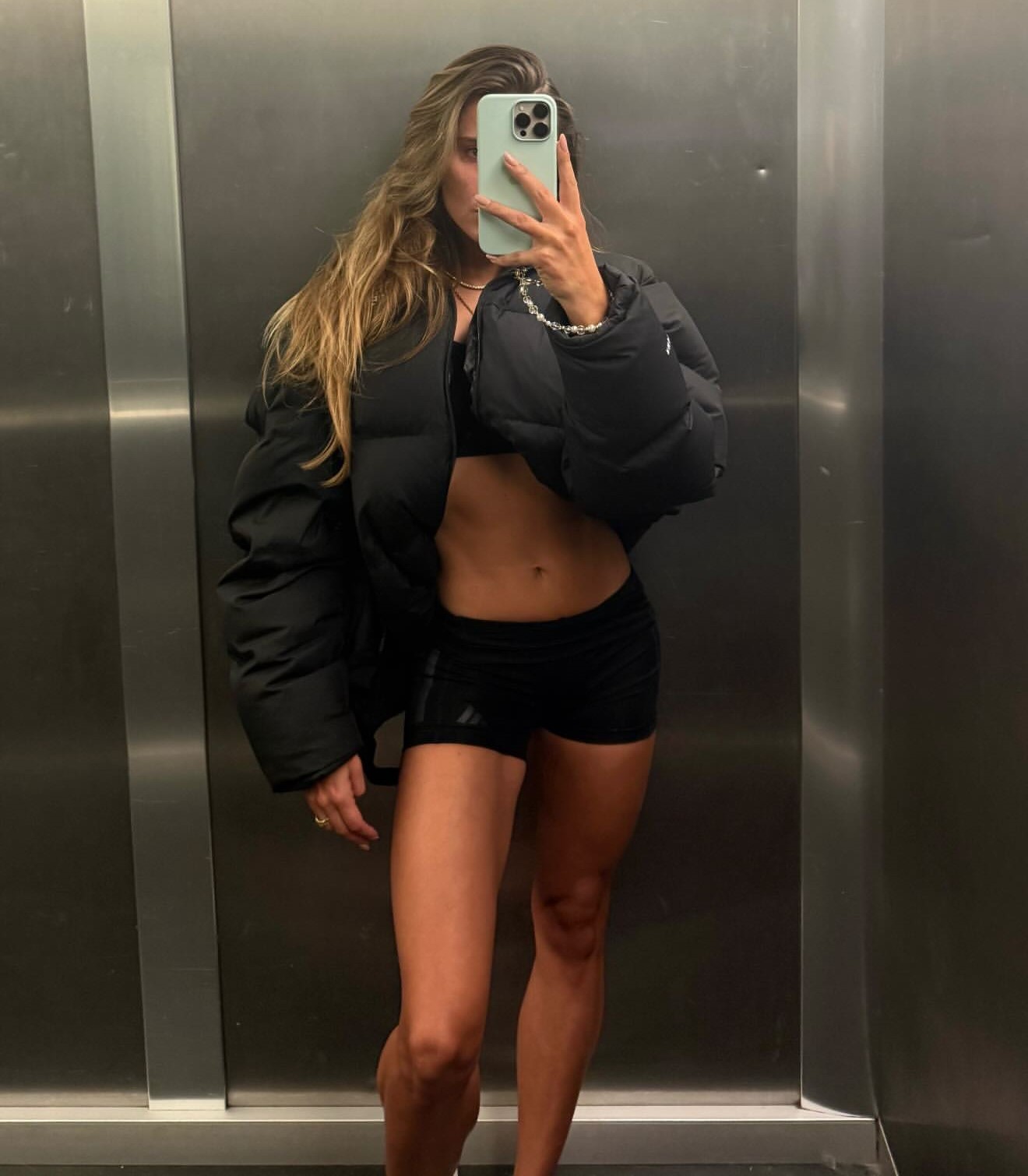 In ihrer Instagram-Story posiert Sophia für ein Selfie, das es in sich hat. Sie trägt eine offene schwarze Daunenjacke, die den Blick auf ein schwarzes Mini-Top freigibt. Dazu kombiniert sie schwarze Shorts, die den sportlichen Look perfekt abrunden.