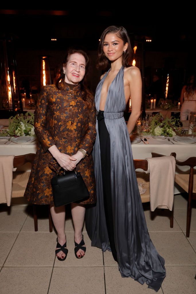 Bei den "W Magazine" und Louis Vuitton's Academy Awards Dinner Anfang März 2024 erschien Zendaya in einem fliederfarbenen Kleid, ohne BH. Der XXL-Ausschnitt reichte bis zum Bauchnabel. Das rückenfreie Kleid, kombiniert mit klassischen schwarzen Pumps und einem Ledergürtel, war eine modische Symphonie, abgerundet durch die weich fallenden Locken der Schauspielerin.