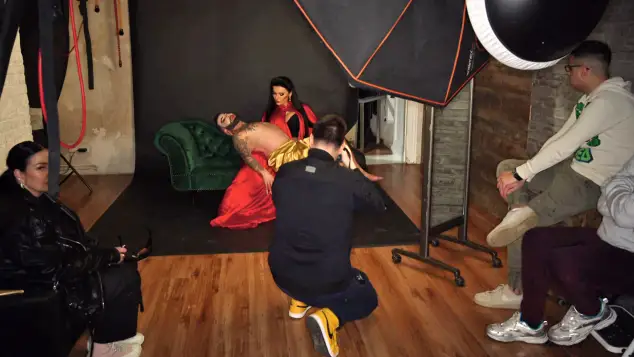 Doch zuerst ging es noch ans Shooting und dabei wurde es gefährlich. Zunächst platzierten sich die Models für die perfekte Pose auf einem Tisch – dann passierte es: Die Kulisse krachte zusammen, samt Harald und Electra.